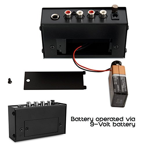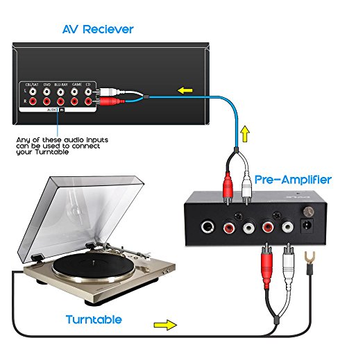 SIMPLE PLUG & PLAY: This mini preamp has stereo RCA inputs and stereo RCA outputs. Connect the turntable to the RCA inputs and ground. Then, connect the amplifier receiver to the RCA outputs. Can also be powered with 9V battery.