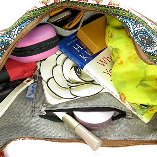 kilofly Bohemian Cloth Crossbody Bag, MiMi Series is made of cotton cloth with a unique Bohemian artistic look. With a knot tied to the small wooden ring, you can adjust the shoulder strap length, easily convert to a shoulder bag or crossbody. The wide strap lessens the pressure on your shoulder and top zipper assures the security of your personal belongings with inside pockets for sort and separation. It is perfect for school, daily outdoor activities like carrying books, laptops, personal belongings, grocery shopping or while travelling. Washing Instruction: Hand wash separately in cold water and avoid soaking; Inner denim texture may fade from frequent washing.