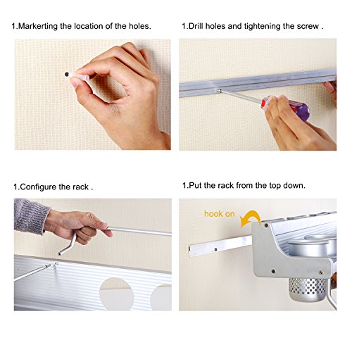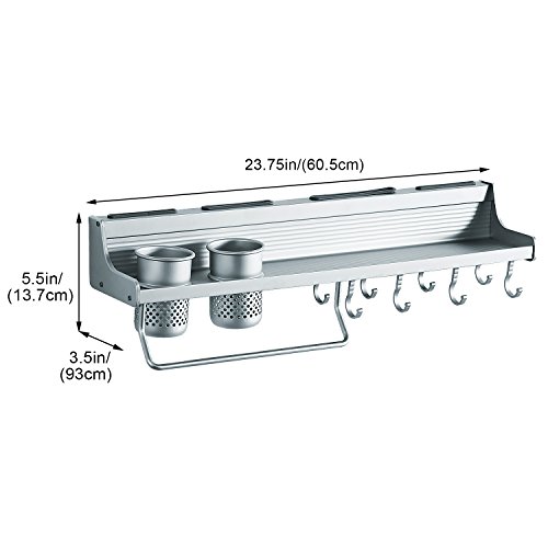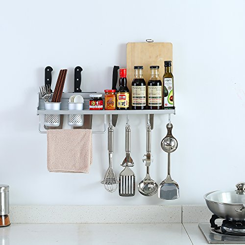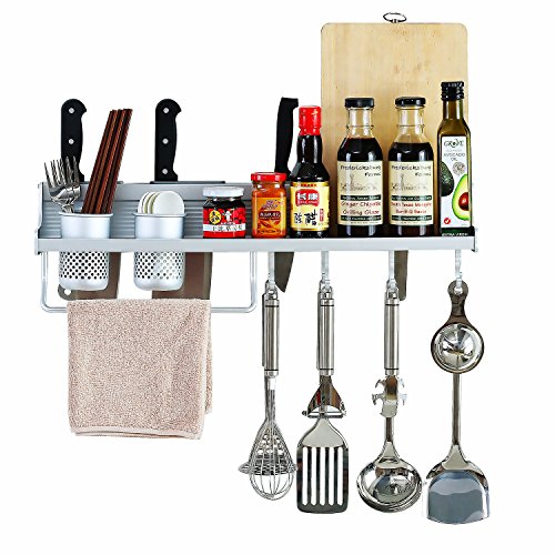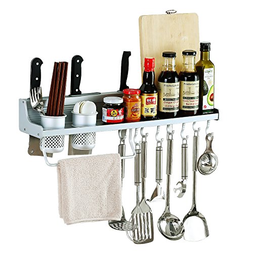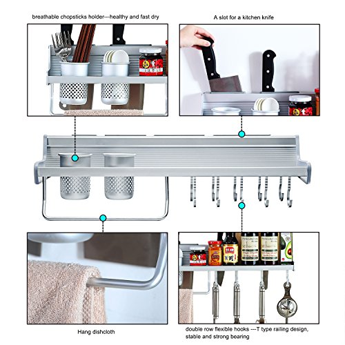 - [Multifunction Wall Hang] This kitchen rack povides a great solution for organizing the messy kitchen. You have no more concern about not enough space to store the spice bottles, soup ladles, kitchen knives pots and pans, it organized your kitchen utensils well and get all stuffs easy to access.