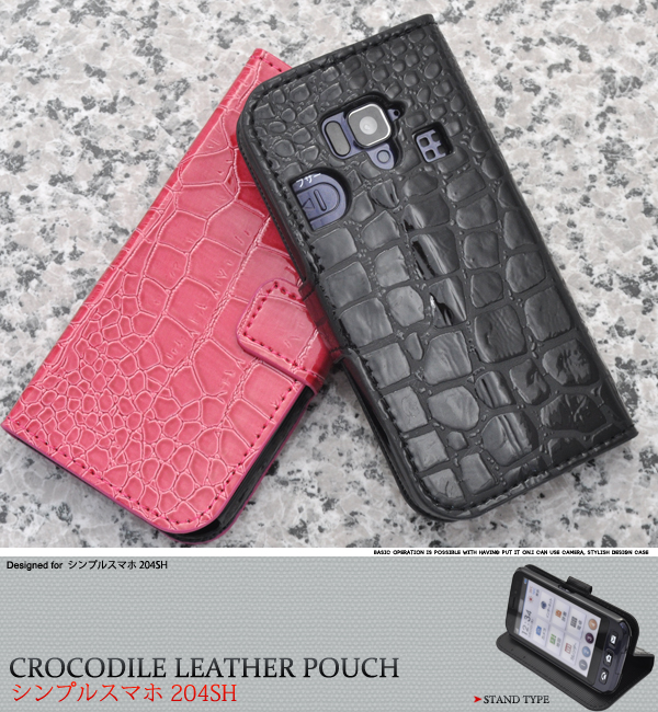 クロコダイルレザーデザインのシンプルスマホ 204SH用スタンドケースポーチ。