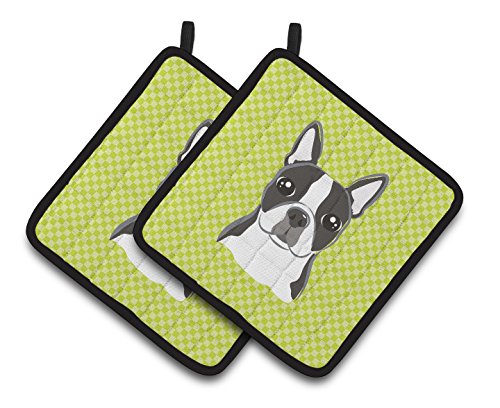 Caroline's Treasures Lime Checkered Boston Terrier Pair of Pot Holders BB1139PTHD, 7.5HX7.5W, Multicolor