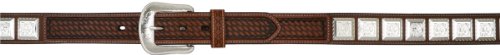 -. Feature : Brown basketweave hand-tooled leather billet and buckle ends / Silver tone square conchos / Single-row contrast stitching / Removable silver tone buckle