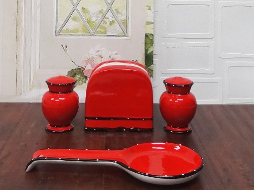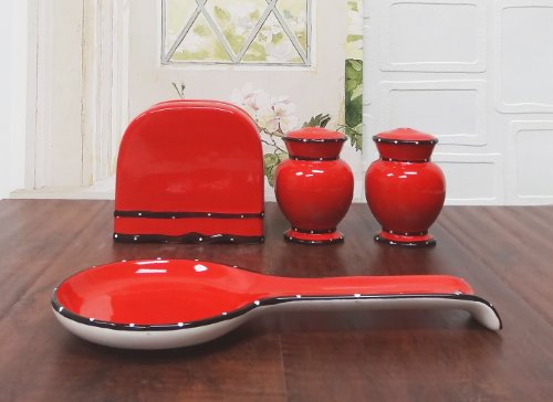 Tuscany Hand Painted Red Ruffle 4pc Stove Top Set, Napkin, Salt, Pepper and Spoon Rest, 85225/28 by ACK