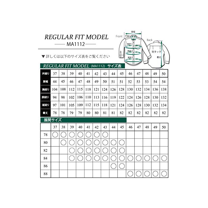 【넥:39㎝】흉순환:112㎝고, 동순환:102㎝고, 어깨 폭:46㎝고, 수첨부(부) 주위:50㎝고, 커프스장:24㎝