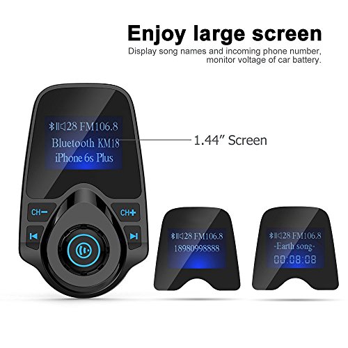 【LARGE DISPLAY SCREEN】1.44inch LED screen display can show current voltage of the storage battery of your car, the name of songs or caller ID, connect information, also FM channel and volume.