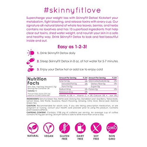 Studio : SkinnyFit Publisher : SkinnyFit Binding : Health and Beauty Product Description Join the all-natural detox movement! Accelerate your metabolism, fight bloating, and cleanse your body. Burn more fat without fasting or going on an extreme diet with SkinnyFit Detox Tea. Our signature blend is made with 13 powerful metabolism-boosting superfood ingredients. It's simple, it's safe, and it works!