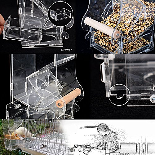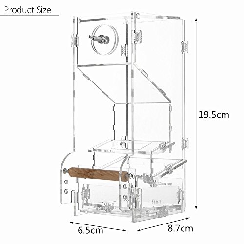 Description: Type: Suitable for parrots Usage: Feeder, Material: Acrylic Color: Clear ? Size: Small, single tank, Image description, actual size Application: parrots, sparrows, orioles and other small birds! Holder about 250g food. can feed days: 15 days (2 budgie)