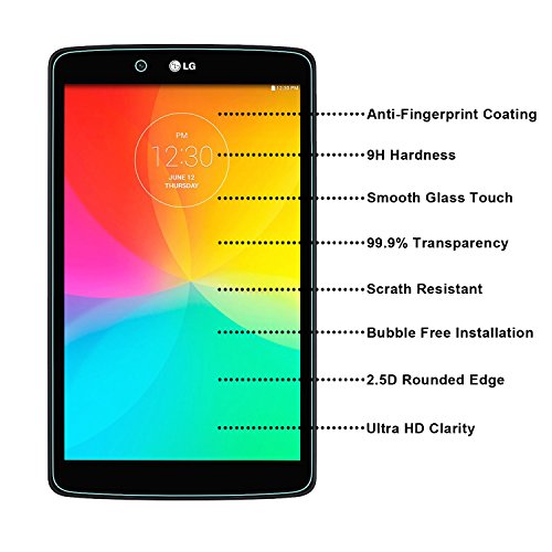 -. Feature : Premium Tempered glass screen protector is specially designed for LG G Pad 8.0 Inch V480 Android Tablet. / Perfect Anti-scratch: The surface of the Tempered glass has a hardness of 9H, three times stronger than regular PET film. Even sharp objects like knives, keys and some other hard substances will not scratch it. / Oleophobic Coating: The glass has an oleophobic coating for an oil-resistant, anti-fingerP.R.Int, glass surface that is easy to clean. / High-response & high-transparency: Only 0.3mm thick + 99.99% light penetration ratio, preserves the original viewing quality and maintains the original touch experience. / Bubble-free adhesives for easy installation and no residue when removed.