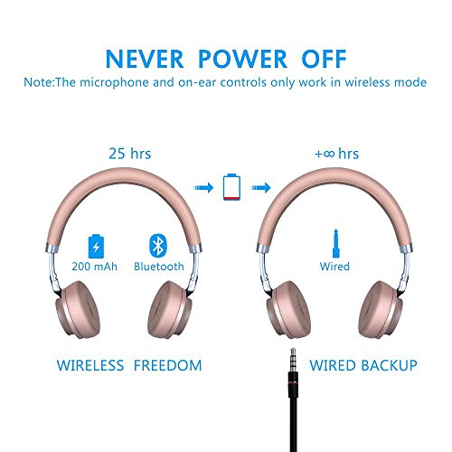 It has dual working modes: WIRELESS & WIRED: 1) The BLUETOOTH MODE: A built-in 200mAh rechargeable lithium battery provides up to 25-hr operating time in a single charge. Easy to recharge it with the included USB charging cable; 2) The WIRED MODE: When battery runs out, you can use it as a wired headset with the 3.5mm audio cable. It will never power off.