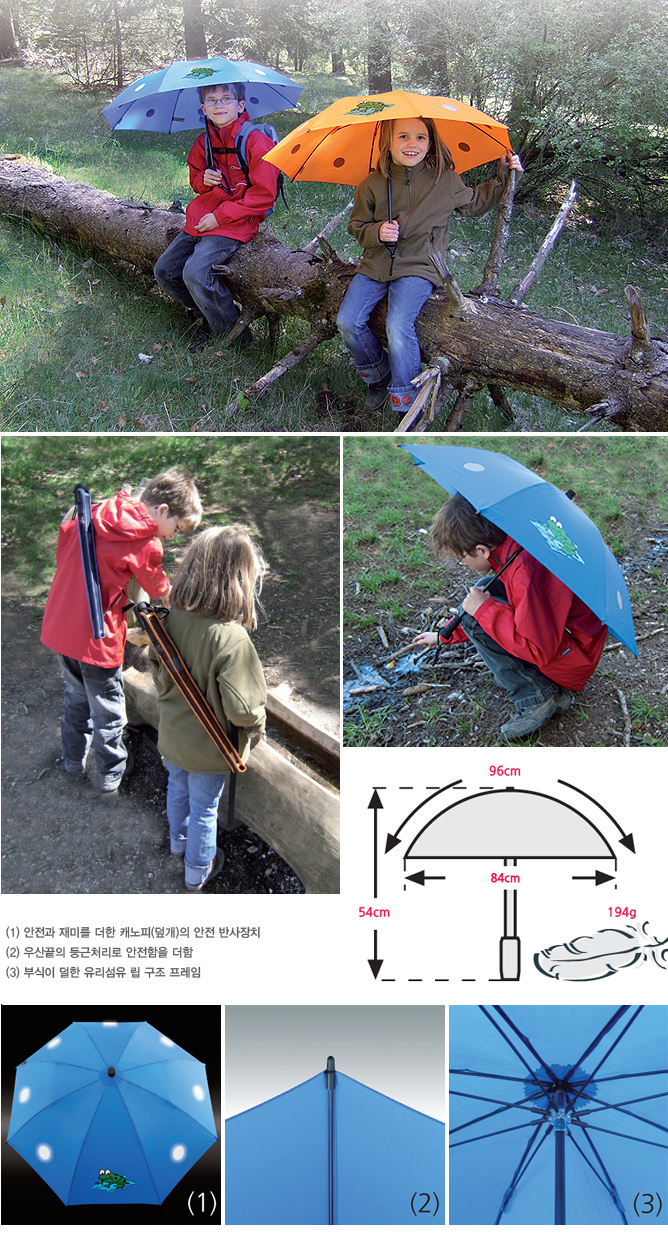 어린이용으로 특별 제작된 트레킹 우산이다. 가볍고 견고하며 편안하다. 캐노피에는 재미있는 디자인 및 안전을 위한 반사 무늬가 새겨져 있다. 손가락이 끼이지 않으며 쉽고 안전하게 펴고 접을 수 있다(3). 벨크로 조임장치로 장착된 우산 끝은 둥근 처리로 안전함을 더한다(2). 중량이 놀라울 정도로 가벼울 뿐만 아니라 굉장히 견고하다. 에버하드 괴벨의 신소재에 대한 절묘한 솜씨로 고내구성과 초경량의 독특하며 놀라운 우산을 탄생시켰다.