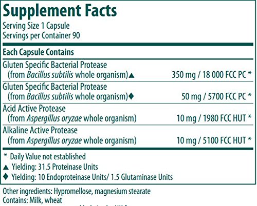 Digest Gluten Plus 90 vcaps Enzyme Supplement Supplemental Facts Serving Size: 1 capsule Servings per Container: 90 Each Capsule Contains: Gluten Specific Protease (from Bacillus subtilis) 350 mg/31.5 Proteinase Units Gluten Specific Protease (from Bacillus subtilis)* 50 mg Acid Active Protease (from Aspergillus oryzae) 10 mg/0.7 CPU Alkaline Active Protease (from Aspergillus oryzae) 10 mg/2 CPU Other Ingredients: Hypromellose, Magnesium Stearate Recommended Adult Dose: Take one capsule with any meal containing wheat, oats, barley and/or rye, or as recommended by your health care practitioner Notice: If you have colitis, gastritis or ulcerative conditions of the stomach or colon, do not use. If you have celiac disease, consult your health care practitioner prior to use Guaranteed to contain no added wheat, yeast, gluten, corn, sodium, sugar, artificial coloring or flavoring or preservatives. Ideal for vegetarians Allergen Information: Contains soy, milk The capsules are made from 100% pure vegetable sources, free of preservatives and additives Quality Assurance: Tamper-resistant package. Do not use if outer seal is missing or broken. Store in a cool, dry place * Yielding: 10 Endoproteinase Units/1.5 Glutaminase UnitsFeature