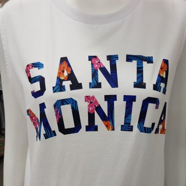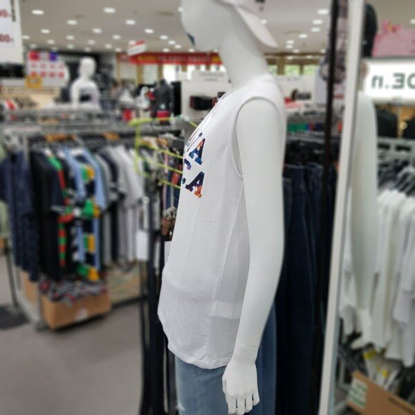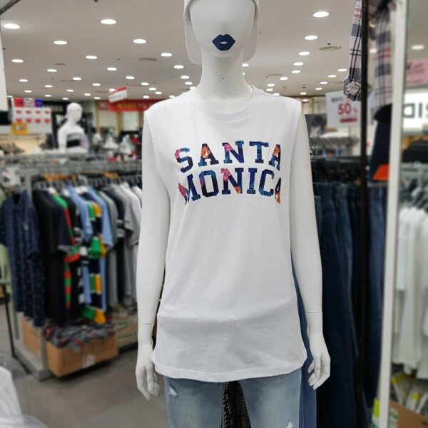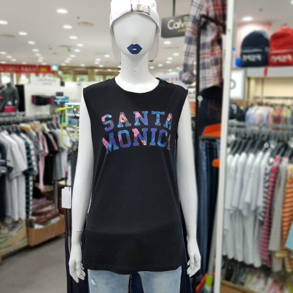 여성용 레터링 민소매 티셔츠 입니다.2018년 S/S 신상품으로 얇고 가벼운 면 소재를 사용해 여름에 착용하기좋은 루즈핏의 데일리룩입니다.앞면 영어 레터링에 꽃무늬가 들어가 여성스럽고 세련된 디자인입니다.