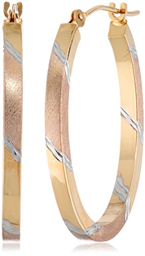 Modern metallic fills the ears with the Duragold 14k Tri-Color Diamond-Cut Hoop Earrings. This classic hoop style will stay secure with its click-top closure. The hoop features diamond-cut shapes in three different metallic stones that create radiant shine with their bold contrasting look. The earrings contain the precision and quality seen in all Duragold jewelry. A unique take on timeless hoops that will add a spark to your fashion-forward style.Feature