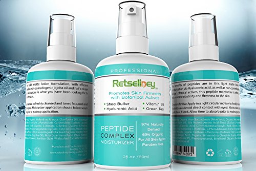 -. Binding : Misc. -. Brand : Retseliney -. EAN : 0616906745572 -. Feature : STIMULATES COLLAGEN PRODUCTION - As you age, your skin stops creating collagen proteins due to which your face starts looking saggy. This highly effective Peptide Moisturizer helps Encourage Collagen Production, Plumps Wrinkles and Fine Lines for Smooth and Radiant Looking Skin, Increases Skin Thickness, and Evens Skin Tone and Elasticity. / NATURAL, ORGANIC AND SUPERIOR IN QUALITY - All Retseliney products are made from the purest form of natural and organic ingredients which are beneficial for your skin and do not contain any Synthetic Dyes, Parabens, Phthalates, Alcohol, Fragrances, GMO's, Petrochemicals or Sulfates. Our products are Made in USA at an FDA approved facility and under the highest level of quality control and skin experts advice. We believe in Good Manufacturing Practices! No testing on animals. / LIGHTWEIGHT, NON-OILY MOISTURIZER - Our Moisturizing cream contains Shea Butter, which possesses incredible moisturizing properties, and hence the use of this cream softens the skin effectively with its regular application. Moreover, our Lightweight Moisturizer get Absorbed easily without leaving any Greasy Residue. The Result is Silky Smooth, Beautiful, soft, and well hydrated skin. It also doesn't have a strong fragrance - making it a gentle and pleasant lotion for your skin. Suitable for men and women, safe for all skin types, including sensitive, normal, combination and oily skin. / FORMULA THAT MAKE THIS MOISTURIZER SO EFFECTIVE - This Non-Sticky, Delicate Matte Lotion Provides Skin with Antioxidant Rich Shea Butter, Non-Comedogenic Jojoba Oil and Refreshing Botanical Actives and advanced peptides leaving a firmer, more youthful looking skin - all in the right proportion to bring a close to magical effect. This Peptide Moisturizer also contains a Powerful Fusion of Nutrients like Botanical Hyaluronic Acid, Vitamin B5, Green Tea, Aloe Vera, all Necessary Ingredients for Anti-Wrinkle Moisturizing, Repair and Skin Rejuvenation. Even Makeup Glides over this Moisturizer very smoothly. For best results use in conjunction with our peptide complex serum. / YOUR SKIN NEEDS MORE - Retseliney has an entire range of skincare products like face wash, creams, face masks, moisturizers, serums, anti-aging creams, etc. which take care of different aspects of your skin and all of them are super effective like this one. We also offer 100% Risk-Free, Satisfaction Guarantee. However, we are quite confident that you will return to us only to buy many more. So, why think twice? Order this Peptide Complex Moisturizer Cream now and take advantage of a Retseliney Limited Time Special Offer - Buy More Than One Product and SAVE! Scroll Down this Page for Details. -. ProductGroup : Beauty -. ProductTypeName : BEAUTY -. Title : Retseliney Peptide Complex Moisturizer Cream to Boost Collagen with Vegan Hyaluronic Acid, Shea Butter & Green Tea, Organic & Natural, Best Anti Aging Anti Wrinkle Lotion for Skin Face -. UPC : 616906745572