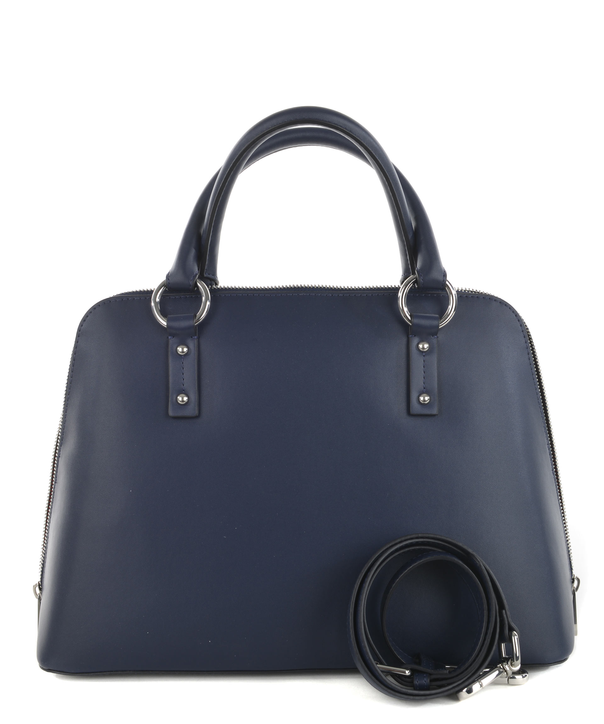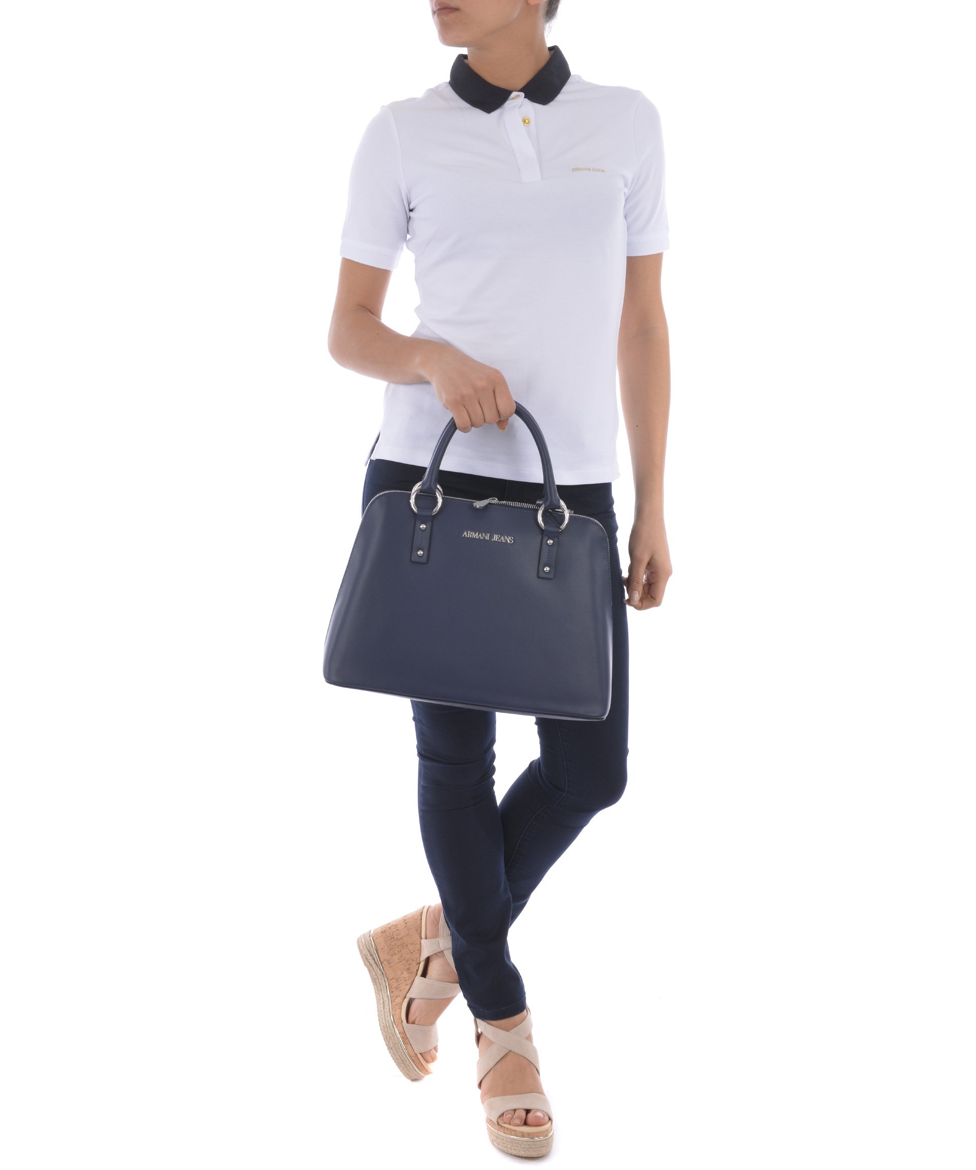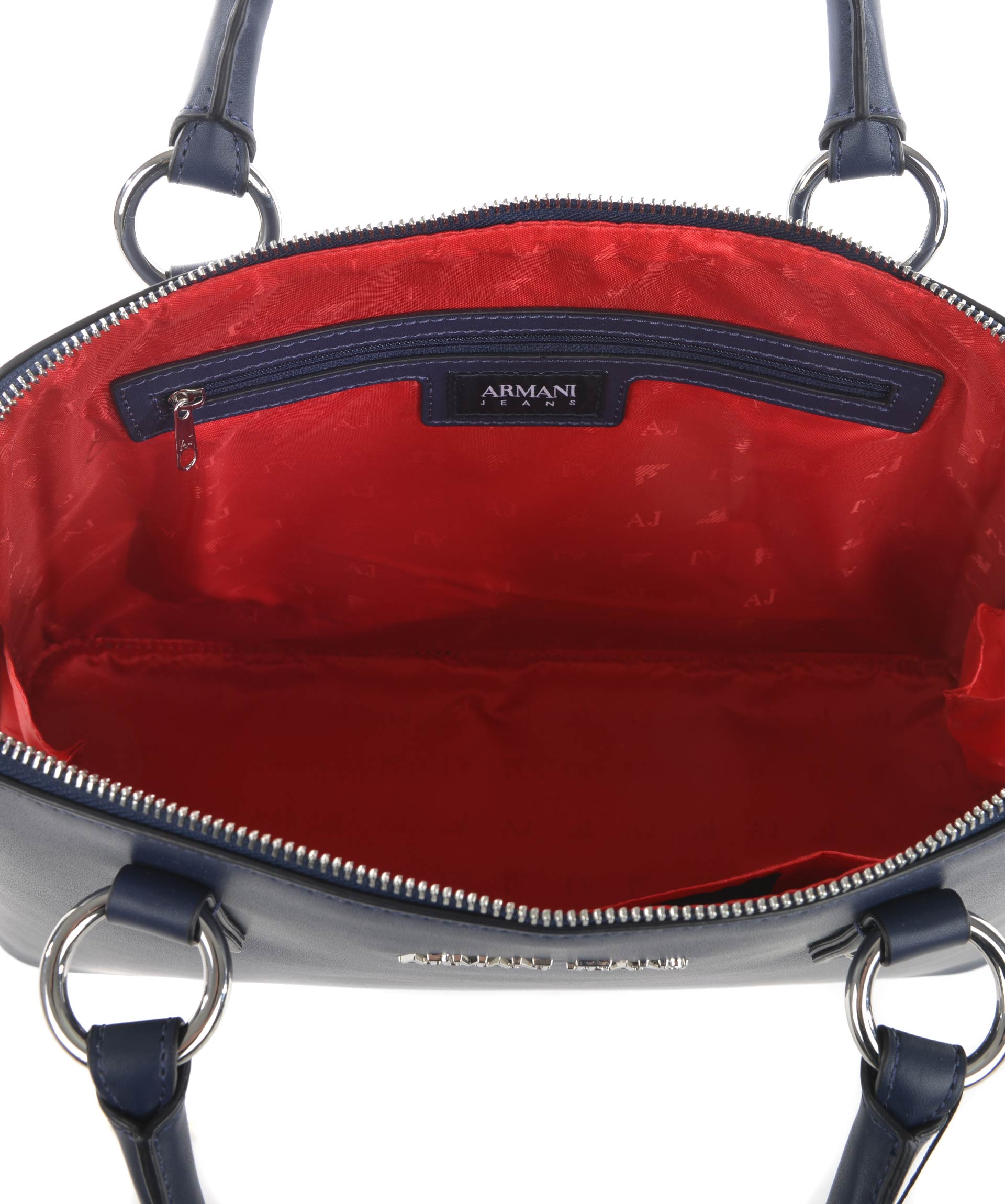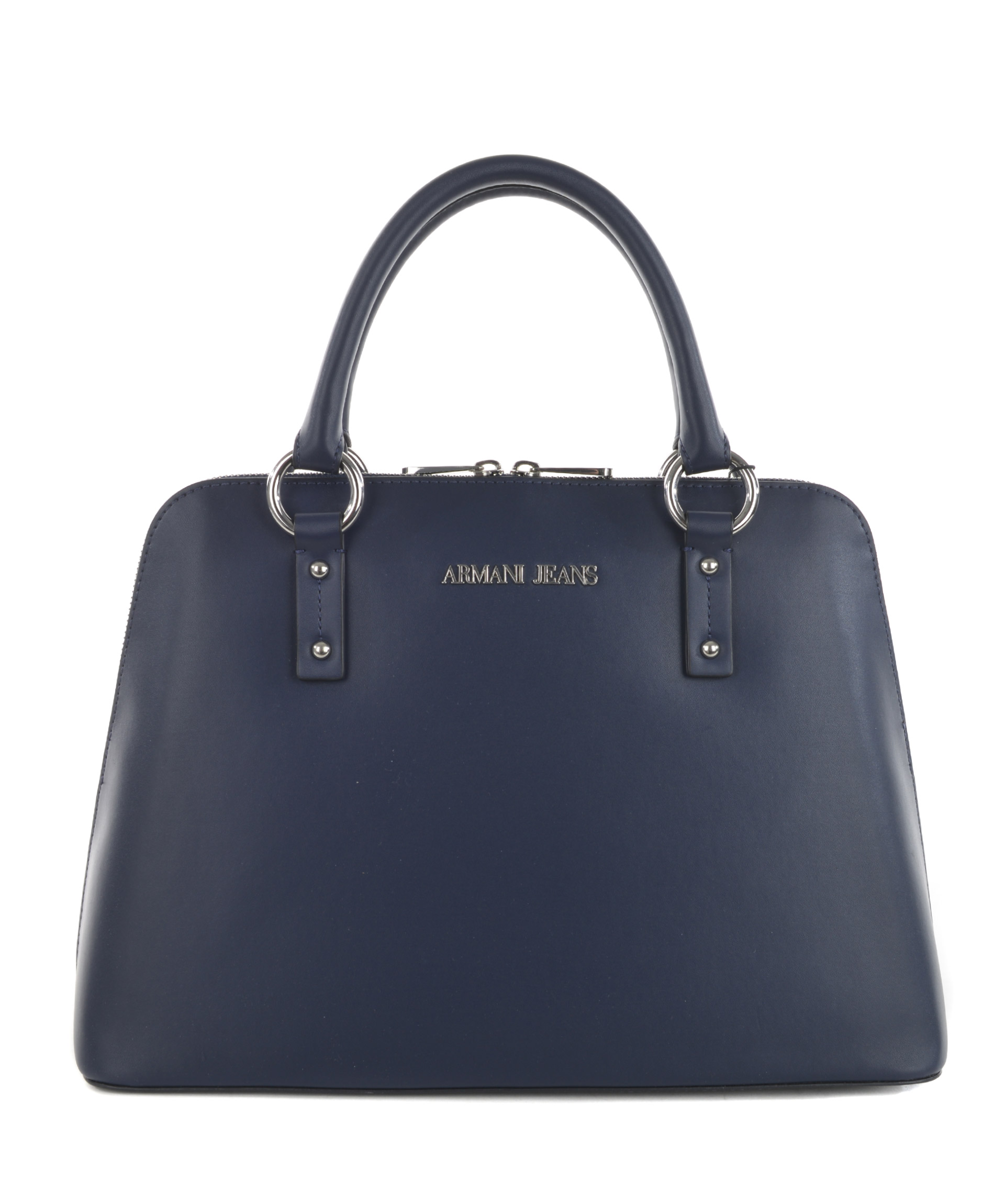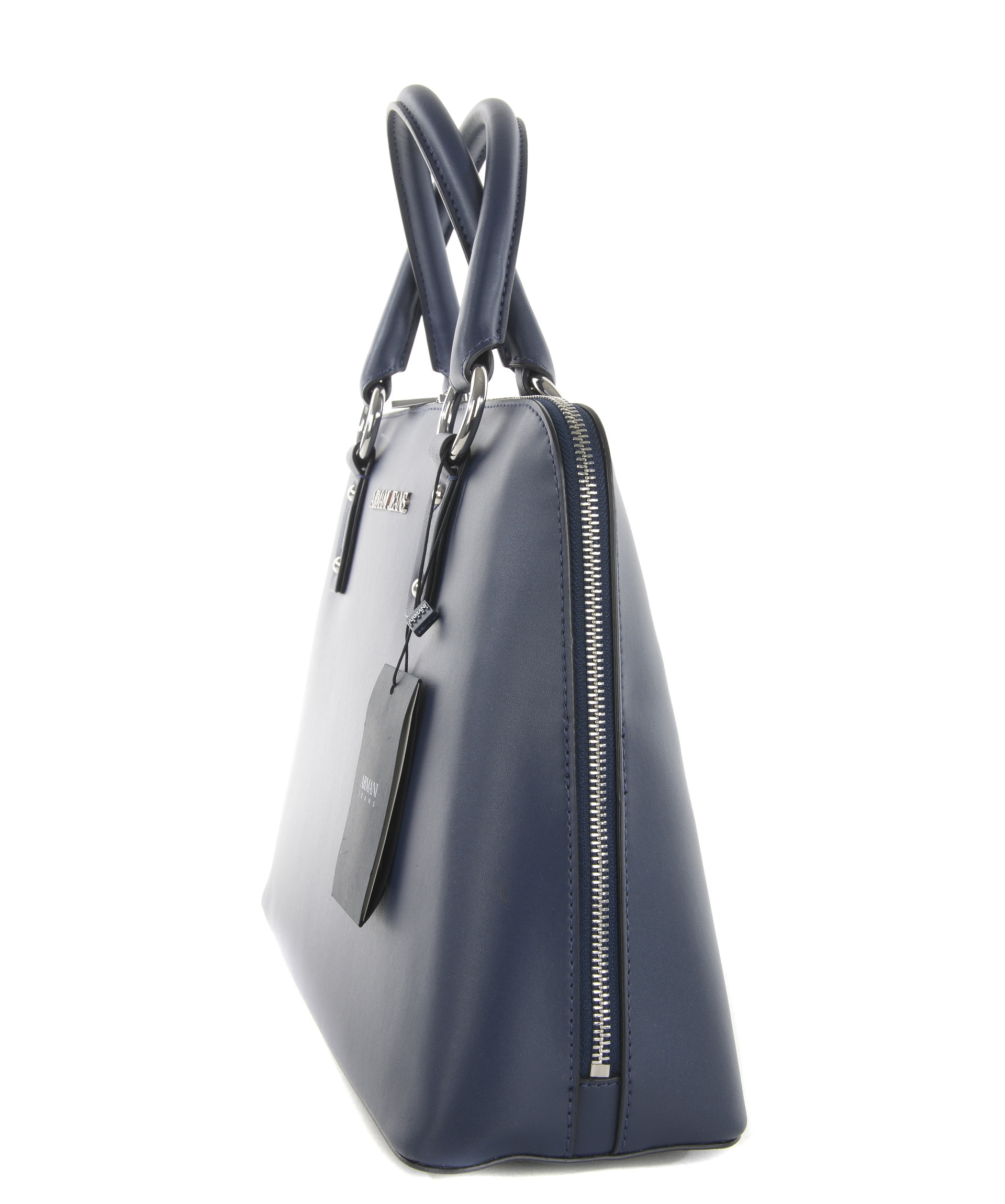 Logo Plaque Tote from Armani Jeans: Blue Logo Plaque Tote with top handle, silver-tone logo plaque, zip around closure, internal logo patch and internal zipped pocket.
