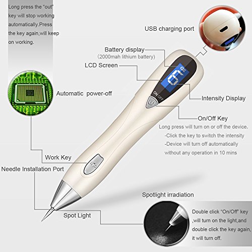 Note: 1.Adjust the mode you need: use small strength when you remove the spots of shallow on small area,use high strength when you remove bad spots on large area. (Please do not puncture the skin during operating!) 2.Large and hereditary syringoma are recommended to be treated in hospital. 3.The device should be charged every 3-4 months if not use for long time.