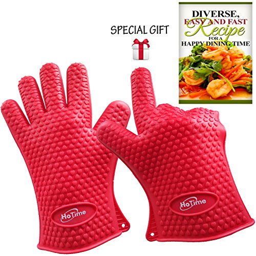 HoTime Silicone Cooking Gloves & Heat Resistant Gloves - Ideal For Cooking, BBQ, Baking, Grilling, and Oven Mitts - (Lifetime Replacement) & {Special Bonuses - Pot Holder and Two Ebooks} (Red)
