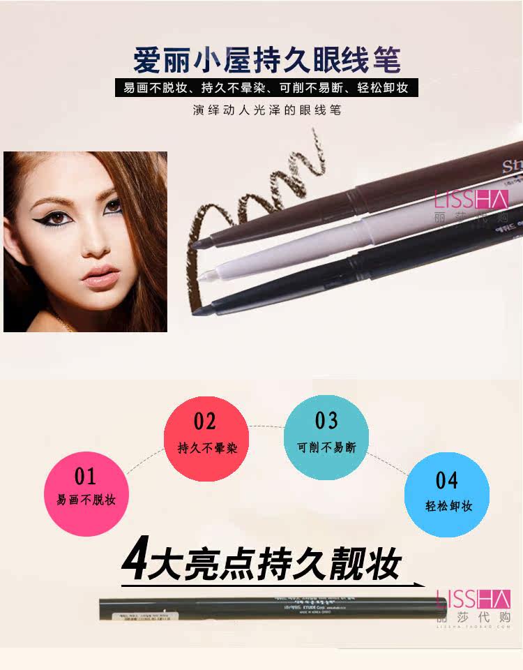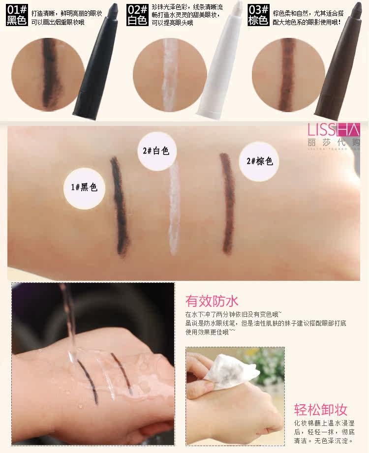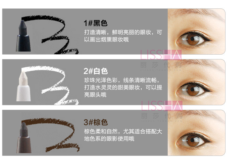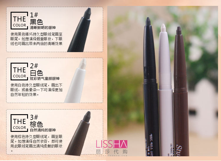 三个色号可选,都是非常实用的颜色 可以根据妆容的不同搭配不同的颜色。眼线笔芯只有2-3cm哦 三种颜色配合可打造韩系电眼
