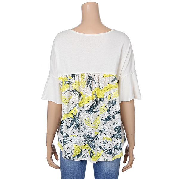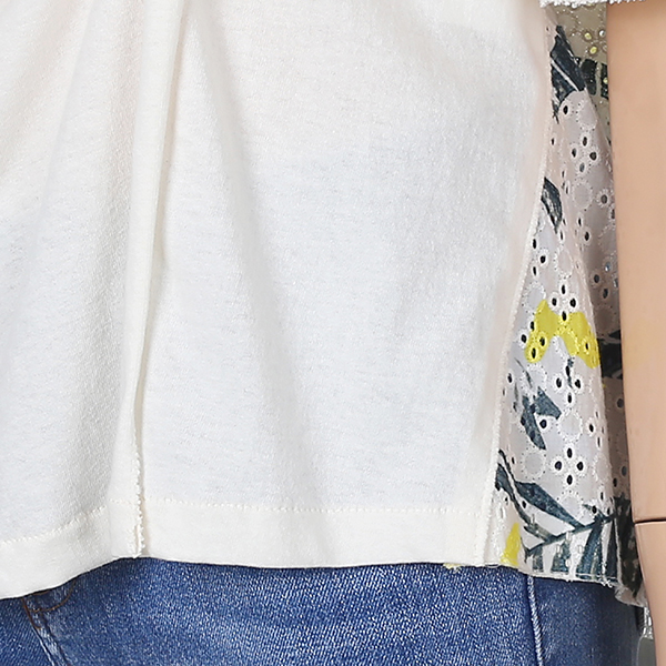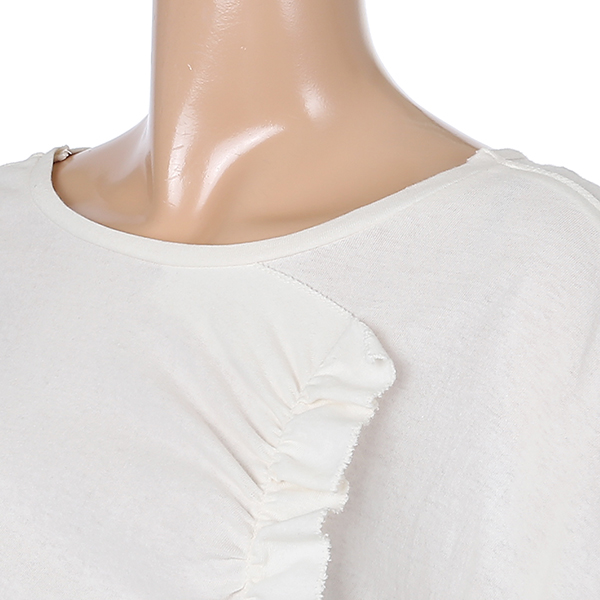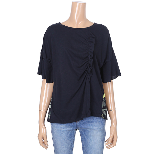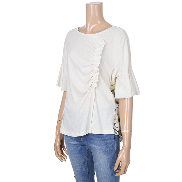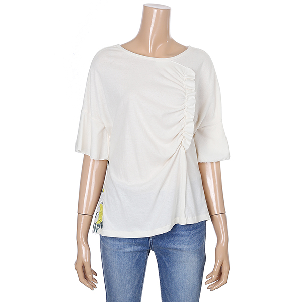 러플 디테일과 시원한 패턴의 패치로 데님 팬츠에 포인트로 코디하시기 좋은 티셔츠입니다.