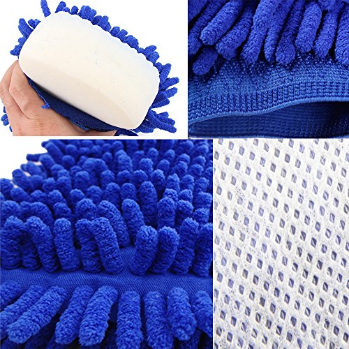 ULTRAFINE FIBER CHENILLE CAR WASH GLOVE: ①The internal sponge soaks up a lot of soapy water so you can keep washing with fewer trips to the bucket. ②On the other side of the Microfiber Wash Sponge is Poly-Mesh netting to gently release bugs and other sticky contaminants.③A built-in pocket enables you to hold onto to the Microfiber Wash Sponge comfortably. ④The Microfiber Wash Sponge is a luxurious way to bathe your vehicle.