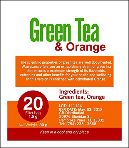 -. Binding : Grocery -. Brand : Wawasana -. EAN : 7751523000697 -. Feature : It is an incredible combination green tea & orange / Green tea contains antioxidants and nutrients that have powerful effect on the body / Orange contains a lot of nutritious and antioxidant properties / Orange helps on arthritis, cancer and heart diseases / 100 % natural green tea -. Label : AURANDINA -. Manufacturer : AURANDINA -. Model : wawasana green tea pure -. MPN : wawasana green tea pure -. PackageQuantity : 1 -. PartNumber : wawasana green tea pure -. ProductGroup : Grocery -. ProductTypeName : GROCERY -. Publisher : AURANDINA -. Studio : AURANDINA -. Title : WAWASANA Green Tea & Orange, Bag Tea 20