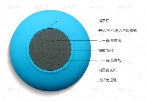 -. Feature : This is a high performance bluetooth wireless speaker/boombox for any mobile device with bluetooth capability / It can be use as a waterproof spearker in the shower room. (Do not immerse the speaker into the water!) There is a built-in microphone, so you can enjoy hands-free phone calls and music while in the shower, at the pool, or in the car / There is a large suction cup attached to the bottom of this device so that it can grab on to any flat surface such as shower, door, windows, tables, pool linings / Don't let the soft shower colors fool you! This little guy reproduces great sound with strong bass / The high capacity lithium battery inside allows long play time (upto 6 hours) on a single charge.