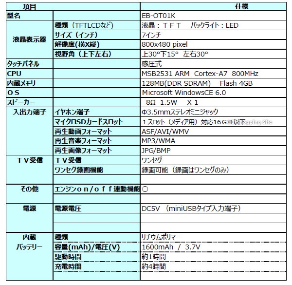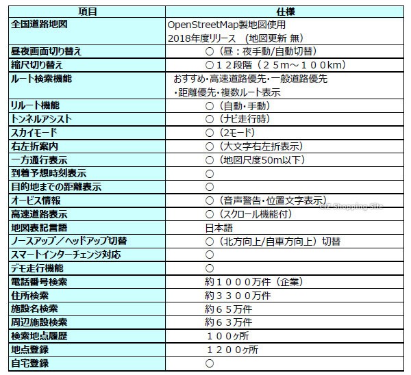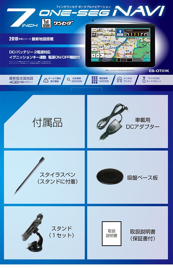 | 商品詳細 | ・7インチ大画面液晶ナビゲーション ・タッチパネル(感圧式)によるかんたんタッチ操作 ・ワンセグテレビ搭載 ・映像、音楽、写真(マイクロSDカード)再生可能 ・最新版全国地図2018年度リリース版搭載 (ベース地図:OpenStreetMap) ※地図更新はありません。 ・オービス警告表示機能搭載 ・イグニッションキー連動 オン/オフ機能搭載 ・DCアダプター(シガーアダプター)、内蔵バッテリーによる2電源対応 ◆2018年度リリース最新マップ搭載モデル。 ◆イグニッションキー連動 オン/オフ機能搭載 ◆ワンセグTV機能付き。 ◆トンネルアシスト機能。 ◆オービス警告表示機能搭載。 ◆DC、バッテリー2電源式。 【仕様】 ・ディスプレイ:7インチ TFT液晶 ・外形寸法:約W178×H110×D14mm ・質量:約260g ・駆動時間:約1時間 ・充電時間:約4時間 【付属品】 ・車載用DCアダプター ・スタンド一式 ・スタイラスペン(スタンドの裏) ・吸盤ベース ・取扱説明書/保証書 【ハードウェア仕様】 サイズ:約178x110x14mm 重量:約260g ディスプレイ:7インチ 液晶:TFT バックライト:LED 解像度:800x480pixel 視野角(上下左右):上30°下15°左右30° CPU:MSB2531 ARM Cortex-A7 800MHz 内蔵メモリ:128MB(DDR SDRAM) Flash4GB OS:Microsoft WindowsCE 6.0 スピーカー:8Ω 1.5Wx1 イヤホン端子:Φ3.5mmステレオミニジャック マイクロSDカードスロット:1スロット(メディア用)対応16GB以下 再生動画フォーマット:ASF/AVI/WMV/MPG 再生音楽フォーマット:MP3/WMA 再生画像フォーマット:JPG/BMP TV受信:ワンセグ(470-770MHz) ワンセグ録画機能:録画可能(録画はワンセグのみ) エンジンON/OFF連動:〇 電源電圧:DC5V(miniUSBタイプ入力端子) 内蔵バッテリー:リチウムポリマー 容量/電圧:1600mAh 3.7V 駆動時間:約1時間 充電時間:約4時間 動作温度範囲(℃):0-45℃ 保存温度範囲(℃):-10-60℃ 【ソフトウェア仕様】 地図部門 全国道路地図:OpenStreatMap製地図使用 2018年度リリース 昼夜画面切り替え:〇(昼:夜手動/自動切換) 縮尺切り替え:〇12段階(25m-100km) ルート検索機能:おすすめ・高速道路優先・一般道路優先・距離優先・複数ルート表示 リルート機能:〇(自動・手動) トンネルアシスト:〇(ナビ走行時) スカイモード:〇(2モード) 左右折案内:〇(大文字右左折表示) 一方通行表示:〇(地図尺度50m以下) 到着予想時刻表示:〇 目的地までの距離表示:〇 オービス情報:〇(音声警告・位置文字表示) 高速道路標示:〇(スクロール機能付) 地図表記言語:日本語ノースアップ/ヘッドアップ切替:〇(北方向上/自車方向上)切替 スマートインターチェンジ対応:〇 デモ走行機能:〇 検索 電話番号検索:約1000万件(企業) 住所検索:約3300万件 施設名検索:約65万件 周辺施設検索:約63万件 登録部門 検索地点履歴:100ヶ所 地点登録:1200ヶ所 自宅登録:〇 |