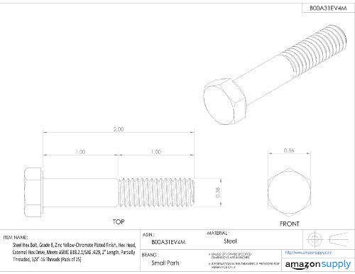 Steel Hex Bolt, Grade 8, Zinc Yellow-Chromate Plated Finish, Hex Head, External Hex Drive, Meets ASME B18.2.1/SAE J429, 2" Length, Partially Threaded, 3/8"-16 Threads (Pack of 25)