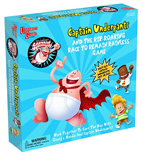 -. Binding : Toy -. Brand : University Games -. EAN : 0794764010916 -. Feature : Watch out for Professor Poopypants, Turbo Toilet 2000, and scores of secret silly surprises / Good ol' fashion tap water adds to the fun / With a helping hand from Harold and George, players work together to save the day / Based on the popular book series and highly-anticipated 2017 Dreamworks film, Captain Underpants: The First Epic Movie / Fun for 2 to 4 players | Recommended for ages 5 and up -. IsAdultProduct : 0 -. Label : University Games -. Manufacturer : University Games -. Model : 01091 -. MPN : 01091 -. NumberOfItems : 1 -. PackageQuantity : 1 -. PartNumber : 01091 -. ProductGroup : Toy -. ProductTypeName : TOYS_AND_GAMES -. Publisher : University Games -. ReleaseDate : 2017-05-01 -. Studio : University Games -. Title : Captain Underpants and the Rip-Roaring Race to Remain Rainless Game -. UPC : 794764010916 -. Warranty : No Warranty