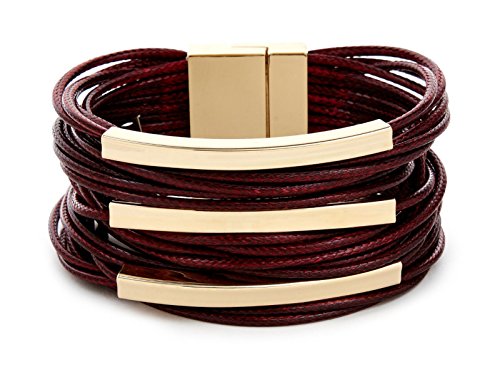 -. Feature : Style: Modish layered cord tube bracelet for women / Fashion Highlight: Burgundy red waxed cord with zinc-plated metal alloy / Materials Used: Plated zinc metal alloy, waxed cord / Measurements: 7 1/2" long; bracelet 1 1/2" wide / Closure: Magnetic clasp