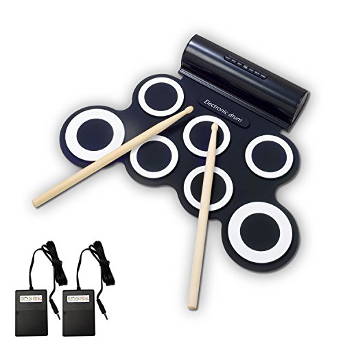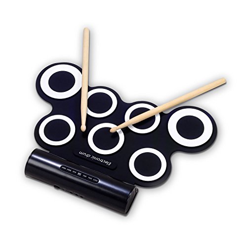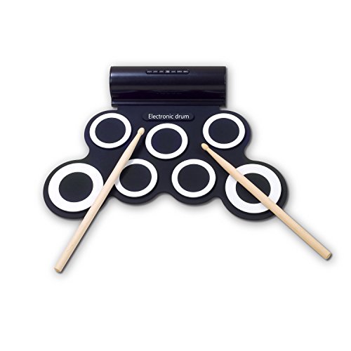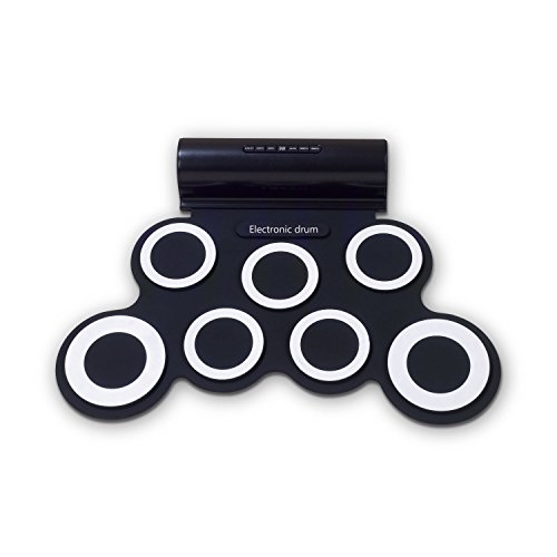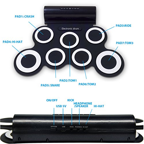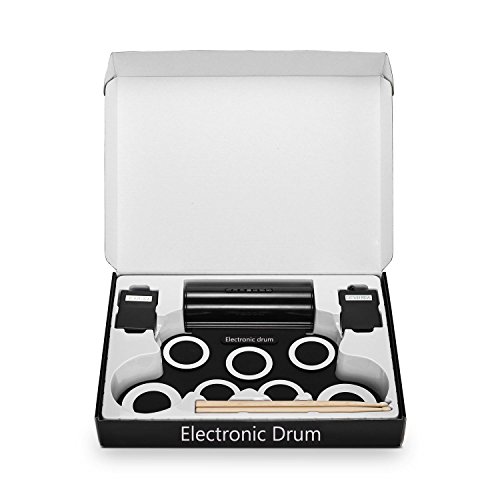 Product Description The fun and portable roll-up electric drum with 7 drum pads, 2 foot pedals, 5 timbres, 8 demo songs, 3 rhythms.Suitable for home entertainment and common music practice, 2 high quality built-in speakers bring super bass effect, do not need to connected with other speakers. It wouldn't take up too much space, the USB MIDI Jack, can be connected with computer to play all drum games. you could use headphone that you won¡?t disturb other people while playing.You can keep it rolled up when you don't use it. This is a fun way to learn music without a traditional drum taking so much space in the room. Specifications Material: Non-toxic and harmless environmental protection silicone, 100% waterproof Output: DC9V/2.5W Input: DC5V/2.5W Dimension: 44mm x 28mm x 0.6mm Net Weight: 1100g Package includes 1 x Hand Roll Drum 1 x Plastic bag 2 x Drum Sticks 1 x User Manual 0