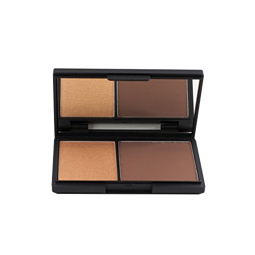This kit contains a finely milled matte contour powder and shimmer highlighter powder in a black matte easy to carry mirrored container.