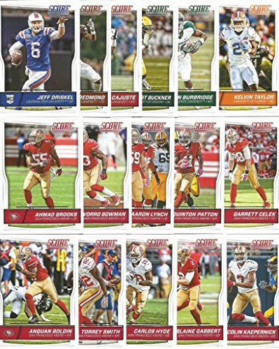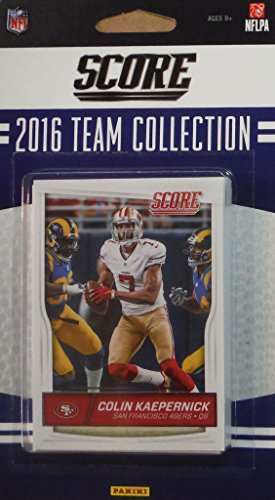 San Francisco 49ers 2016 Score factory sealed 16 card team set including Colin Kaepernick, Blaine Gabbert, Carlos Hyde, Torrey Smith, Anquan Boldin, Garrett Celek, Quinton Patton, Aaron Lynch, NaVorro Bowman, Ahmad Brooks, Aaron Burbridge, DeForest Buckner, Devon Cajuste, Jeff Driskel, Kelvin Taylor and Will Redmond.