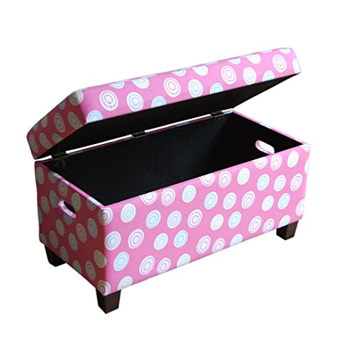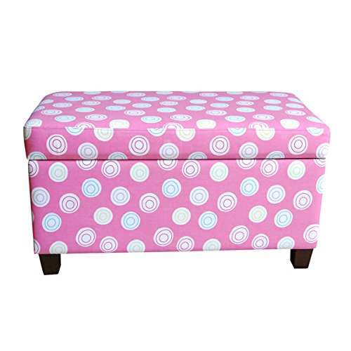 -. Brand : HomePop -. Color : Pink -. EAN : 0726325694716 -. Feature : Double safety-hinged lid protects against pinching / Decorative solid wood legs embellish the beauty and style of this piece / Cut-out handles on the side permit ease in moving the unit / Measures 18 inches high x 32 inches wide / This cushioned bench makes a lovely window seat and may use this piece at the foot of the bed for storage -. Label : HomePop -. Manufacturer : HomePop -. Model : K6407-A500 -. MPN : 15780864 -. PartNumber : 15780864 -. ProductGroup : Furniture -. ProductTypeName : HOME_FURNITURE_AND_DECOR -. Publisher : HomePop -. Size : 18 inches high x 32 inches wide -. Studio : HomePop -. Title : Kid's Storage Bench of HomePop Deluxe with Pink Swirling Pattern Features Comfortable Cushion, Solid Wood Legs and Double Safety-Hinged Lid, Perfect for Girl's Bedroom -. UPC : 726325694716