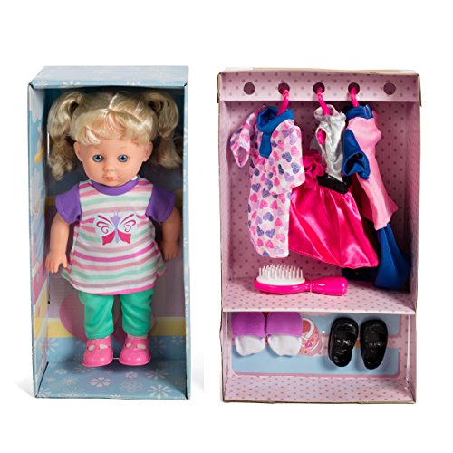 14'' soft body fully dressed doll with 3 extra outfits and toys for the doll.