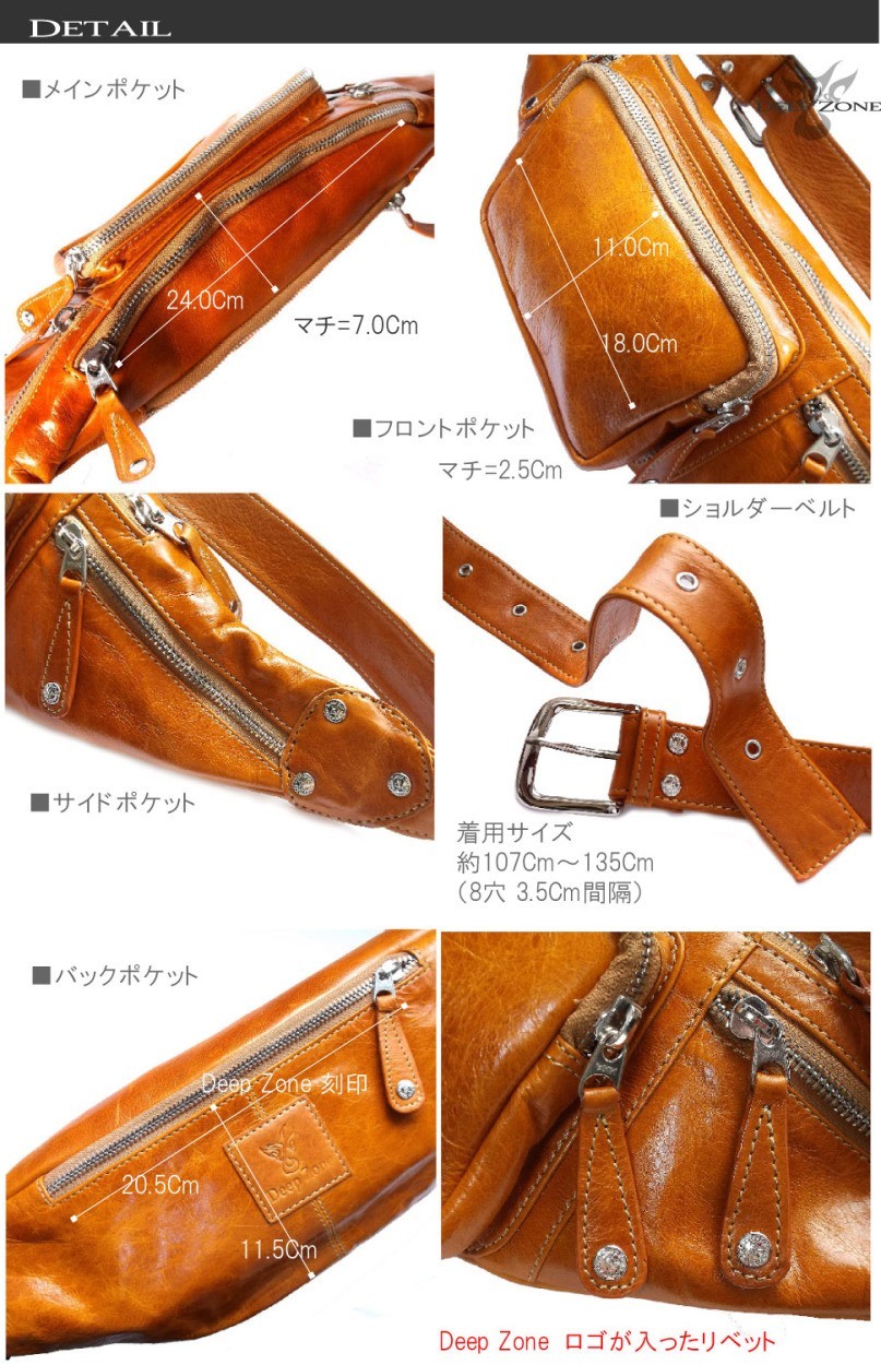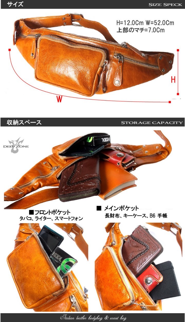 一流革職人がハンドメイドで仕上げた本革レザーボディバッグ。独特の深み有る艶と擦れ感が特徴のイタリアンレザー。非常に柔らかく、軽くそして丈夫!財布、スマートフォン、車のキーや手帳、などの小物をスタイリッシュに持ち運びできます。ショルダーベルトは長さ調整は可能、ウエストバッグとしても使えて機能性に優れています。【素材】 牛革 一部裏地に綿キャンバス生地 金具:合金【サイズ】 H=12.0cm W=52.0cm D=7.0cm 【仕様】 詳細画像に記載しています。ストリートファッション レザーバッグちょい悪オヤジファッション レザーバッグ本革 メンズ レザー ボディバッグ ワンショルダーバッグ