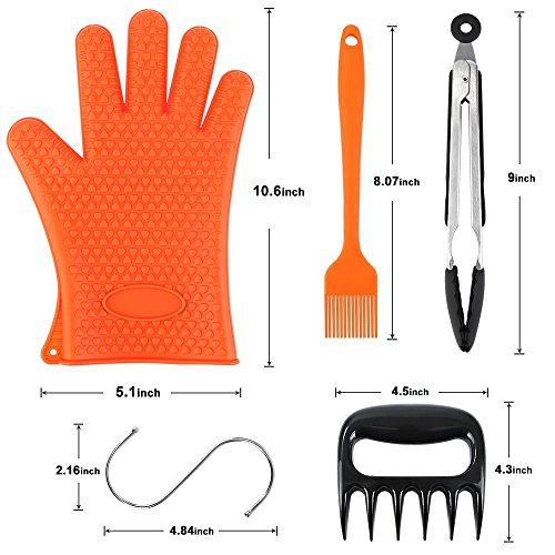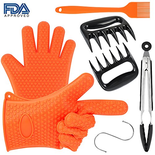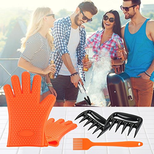 Silicone BBQ Set-Heat Resistant Grill Oven/Cooking Gloves, Meat Shredder Claws, Kitchen Tong, S Hook and Silicone Basting Brush,Super Value of Barbecue Accessories for Cooking, Barbecue