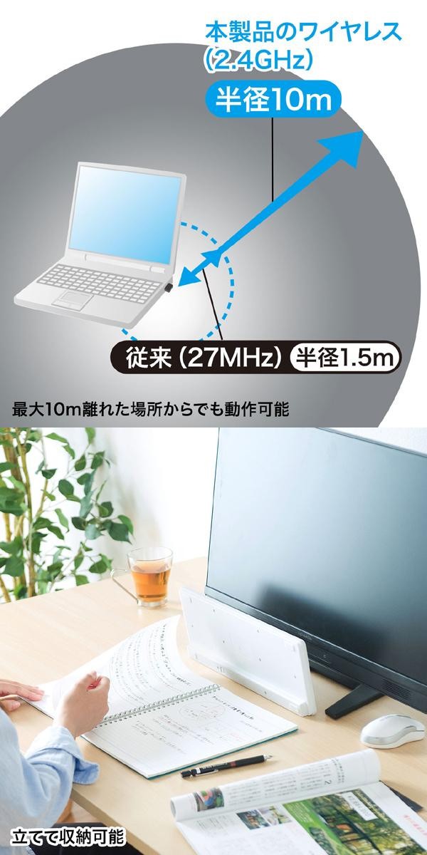 電波の到達距離の長い、周波数2.4GHzタイプで、最大10m離れた場所からでも動作可能です!隣合うキーを押しにくい「アイソレーション」タイプのキーボードで、誤入力を軽減します。テンキーなしの省スペース設計。 |