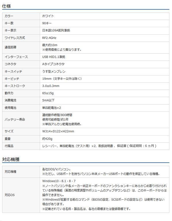 | 電波の到達距離の長い、周波数2.4GHzタイプで、最大10m離れた場所からでも動作可能です!隣合うキーを押しにくい「アイソレーション」タイプのキーボードで、誤入力を軽減します。テンキーなしの省スペース設計。 |