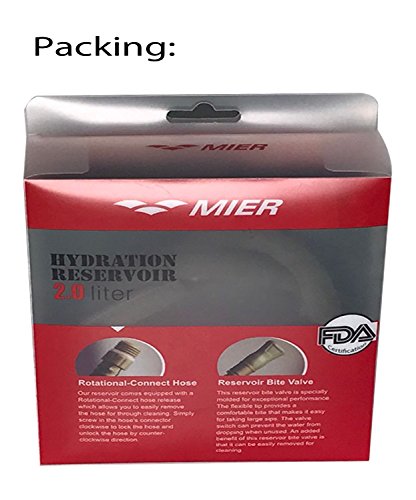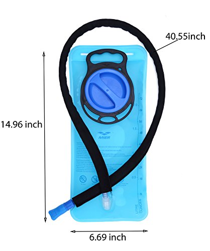 -. Feature : Food-Grade Premium Material----MIER Hydration pack is made of high quality TPU, BPA-FREE and FDA APPROVED food-grade antibacterial bladder, which is durable, pressure-tolerant and wear-proof / Leakproof Water Reservoir----Using leak proof sealing technology, screw cap and rotational-connect hose made this bladder pack waterproof / Easy Cleaning Bladder----Large wide mouth opening for water fill-up or refilling, easy for cleaning and drying. For cold water, add ice cubes directly from a scoop or refrigerator ice dispenser / Insulated Tube with Bite Valve----Soft anti-microbial mouthpiece for wholesome and effortless sipping(Push-in bite valve with soft flexible tip), Insulated hose helps keep water cool in summer and prevents freezing in winter (Tube length: 40.55"). Detachable tube for easy storing / Keep Hydrated----With size 14.96"*6.69"(L*W), the bladder can be hold in 2 liters(70 ounces) of fluid capacity, enough stay hydrated for running, biking, cycling, hiking, camping, traveling. Easily fitting into most kinds of pockets and backpacks