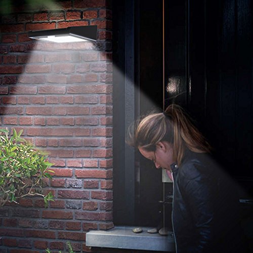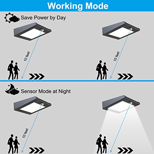 - [ALWAYS MAKE YOUR HOME FEEL SAFER]-- The light feature motion sensors with 120-degree sensing angle and a longer sensing range of 10-26 feet, always ensures you'll never be left in the dark. 3.6“×4.9, the biggest solar panel in the market, with 1200mah lithium rechargeable 18650 batteries, provide even days of working time. You'll always know if someone (or just a curious raccoon) is skulking around outside.