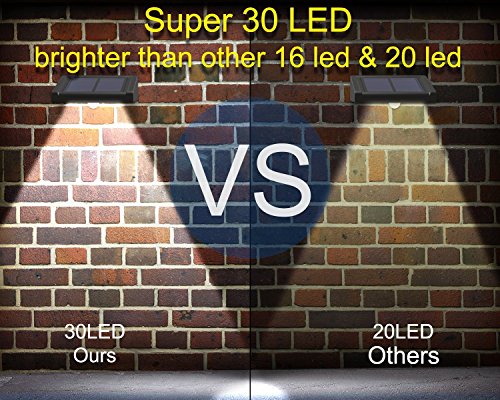 - [EXCLUSIVE 30 LED DESIGN] -- Days growing shorter, but you will never have to fumble for keys when you get home if you have this 2 pack solar lights. With 15 LEDs on both side, 30 LEDs can provide plenty of light no matter the time, compared to eight you’d find in most competitors, and picks up motion from 15 feet away. For 30 LED lights in the market, this pack is the most cost-effective one.