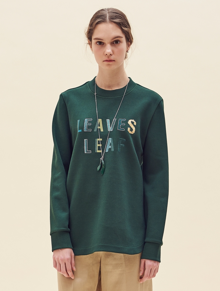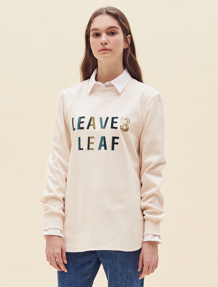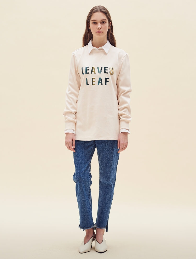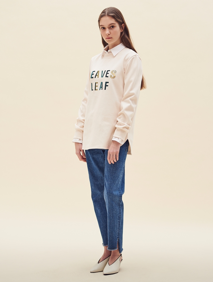 - 전면의 레터링 프린트와, 자수, 스팽글 등으로 장식된 원포인트 디자인의 티셔츠입니다.