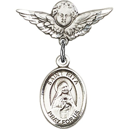 -. Title : Sterling Silver Baby Badge with St. Rita of Cascia Charm and Angel w/Wings Badge Pin 7/8 X 3/4 inches