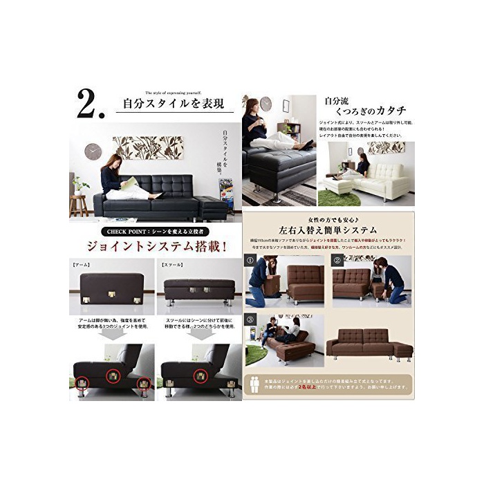 【사이즈】2P:W150×D105×H38(cm)stool:W102×D38.5×H36(cm)암:W79.5×D17×H38(cm)씨트 하이:38(cm)팔걸이 높이:48(cm) ◆재질:우레탄/웨이 빈《구베루토》/S스프링/면/아티피셜 레더/천연목 ◆내하중:2P:150kg / stool:70kg ◆기능:수납 부착/조인트 시스템 탑재/3단계 리클라이닝 ※조립은,반드시 2명 이상에 행하고 하십시오.