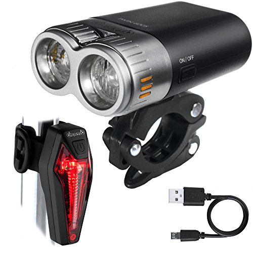 -. Feature : THE FULLEST KIT OF BIKE LIGHTS. The Vibiker bike light set Twin 600S includes: front bicycle light with high 600 lumens power and tail light. In addition to this bike gear, the kit includes a 30 cm (12 inch) USB-Cable for simple and quick charging. Both lights are IPX-4 waterproof, which makes their use and care easier. / UNIQUE TECHNOLOGIES ARE USED. The bike light kit uses an optical technology of light bunch spreading, which ensures the best ration curve between luminous intensity and energy consumption. 4 light modes in the front cycle light: near and far light, Flash and Cross Light (in both lights). When riding on wide pavement, switch it to horizontal light mode. When riding on narrow pavement, switch it to vertical light mode. / HIGH CAPACITY RECHARGEABLE LI-ION BATTERY. The rechargeable bike light kit has powerful batteries - 3000 mAh (for the front light) and 180 mAh (for the back light) with 400 recharges. Using high-quality, strong batteries allows the bike light to work longer. The front light works in single mode for 6 hrs and in twin light mode for 3 hrs. The tail lights work for 3,5 hours in constant mode and 6,5 hours in flash mode. / IMPROVE YOUR SAFETY. With the help of the rechargeable front bike light and the tail bicycle light you not only can light your way when cycling, but you can make yourself more noticeable on the road. The design on the side of the front light is not just a decoration. It allows you to be easily seen by motorists and greatly improves your safety. / RELIABLE CONSTRUCTION. The design of the Vibiker front bike light includes aluminum elements. A great look, reliability, ease and comfort of mounting - all these things make our bike lights the best solution for a bike (for children, men, and women). The quality of the equipment is ensured by a manufacturer guarantee. In addition, you get a Rechargeable USB-Cable 12 inch long so charging the lights is easy and convenient.