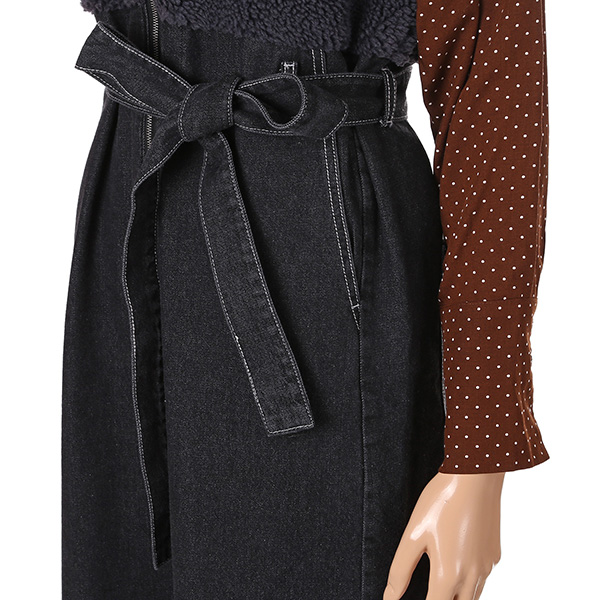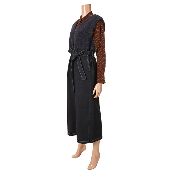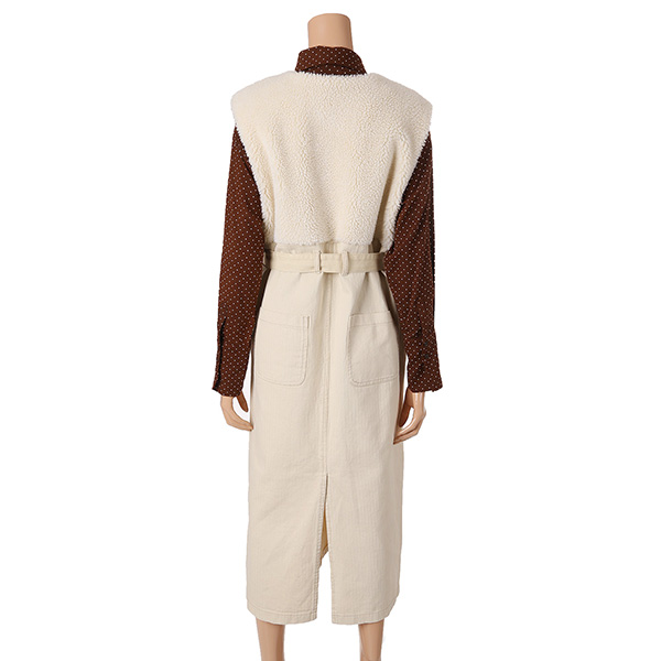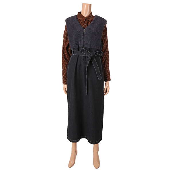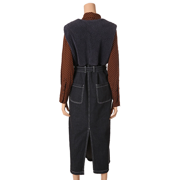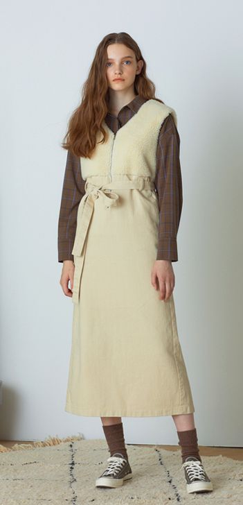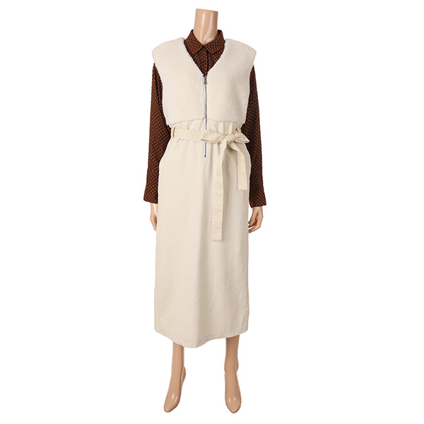 멜빵 스타일의 보아털 배색 원피스 제품입니다
