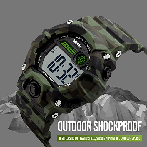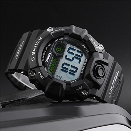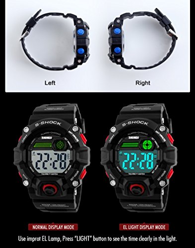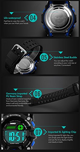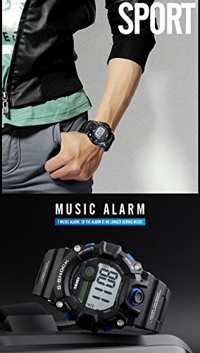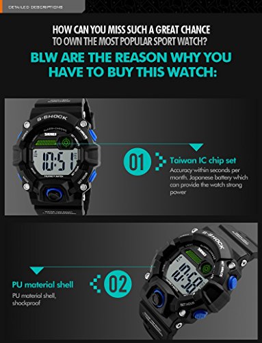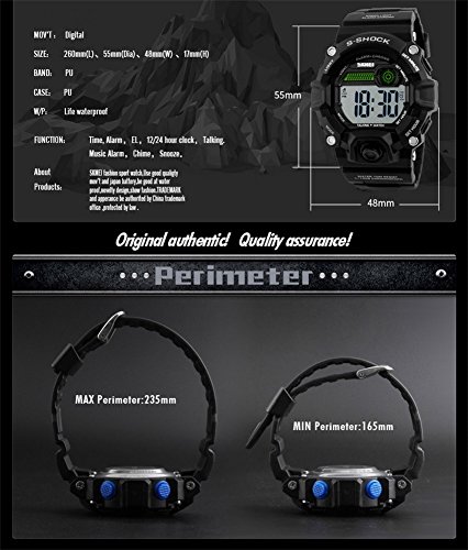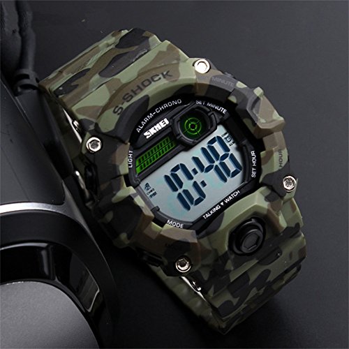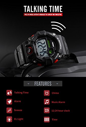 -. Feature : POWER BATTERY: Japanese Movement, provide precise and accurate time keeping. Back-up-battery / Multifunction: Talking Time (Speak English), 7 Music Alarm, Snooze, Chime, Backlight, Shockproof, 12h/24h / SHOCK RESISTANT: The excellent ABS Plastic case and Stainless Steel case back which enable the watch to be tough and durable. / EASY TO READ: Large Dial and numbers screen LED backlight design, check the time easily at the night or the place where the light is weak, also with the calendar function, very convenient. / This is a great gift for your friends, lover or yourself