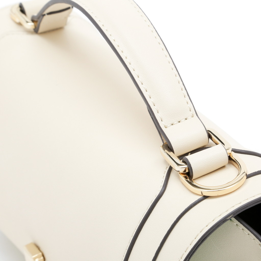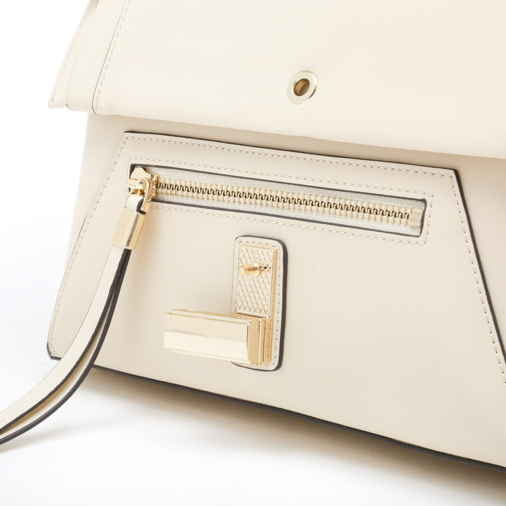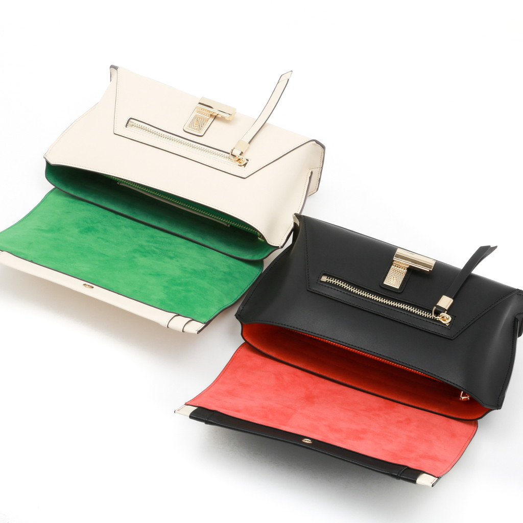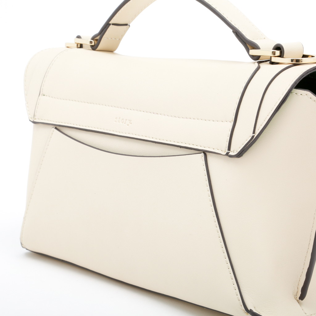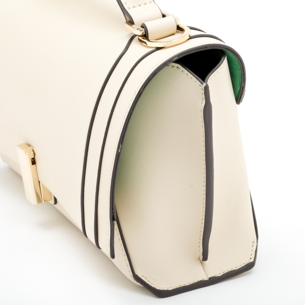 フラップ端の切り替えがポイントになったハンドバッグです。フラップ先のロック金具は左右へターンさせる個性的な仕様。また、裏地には軽やかでフレッシュなカラーを使用し、春夏らしい優しいムードに仕上げています。中身を整理しやすい機能性に優れたデザインで、手持ちやショルダーバッグ、クロスボディとしても活躍します。