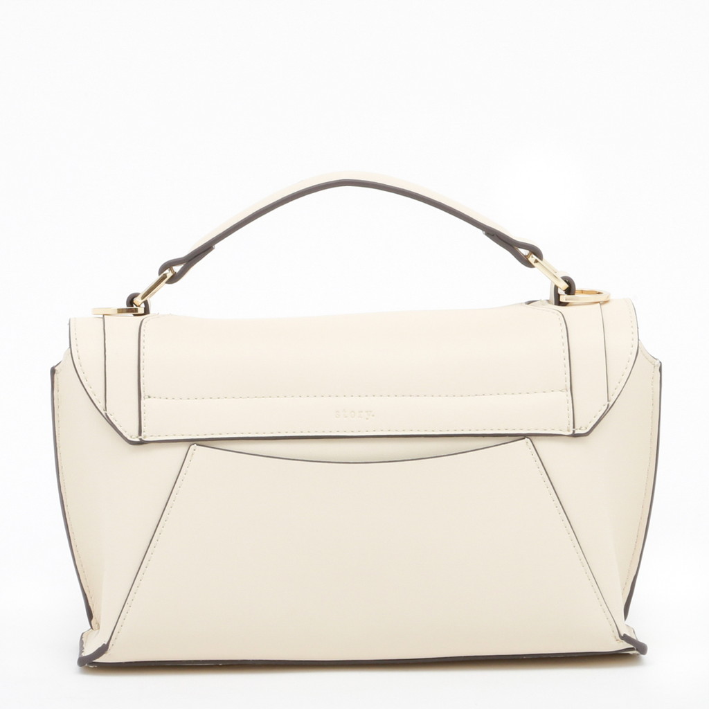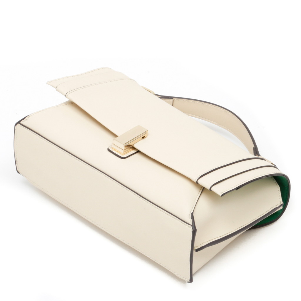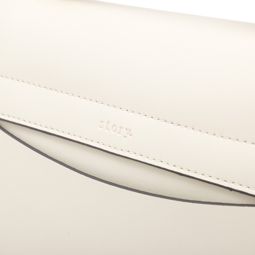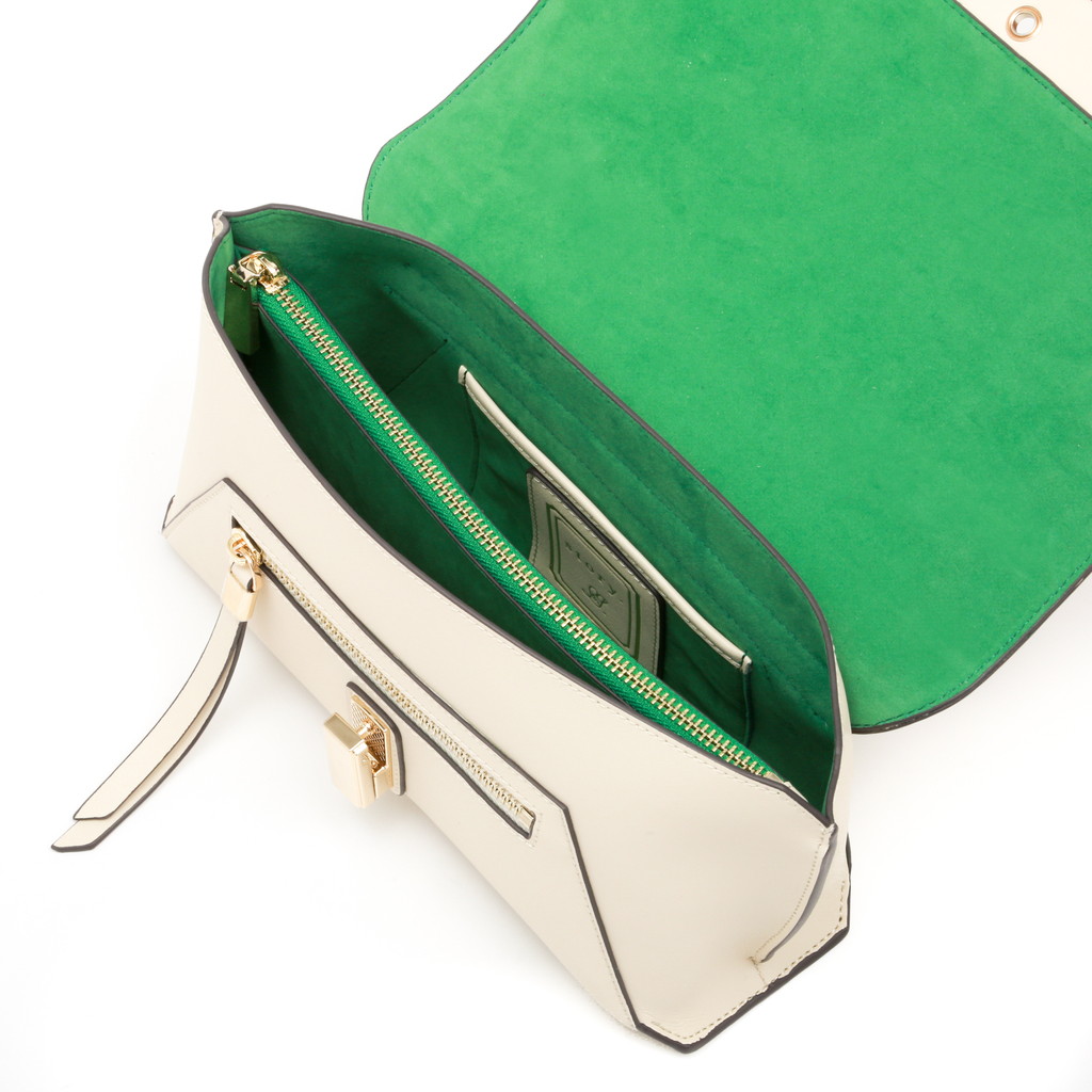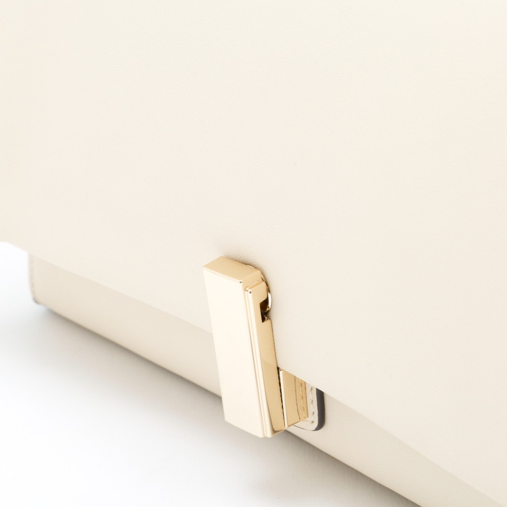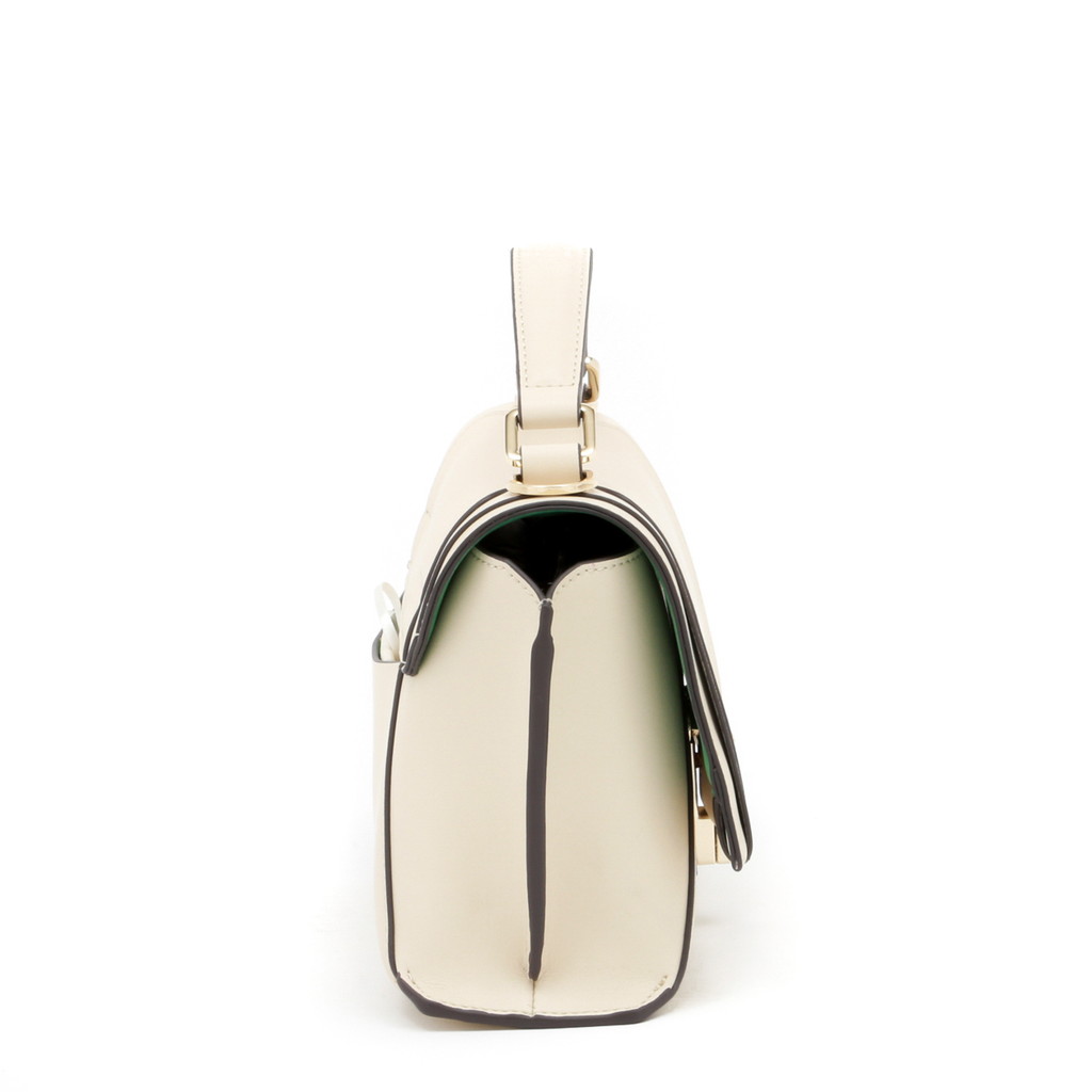 フラップ端の切り替えがポイントになったハンドバッグです。フラップ先のロック金具は左右へターンさせる個性的な仕様。また、裏地には軽やかでフレッシュなカラーを使用し、春夏らしい優しいムードに仕上げています。中身を整理しやすい機能性に優れたデザインで、手持ちやショルダーバッグ、クロスボディとしても活躍します。